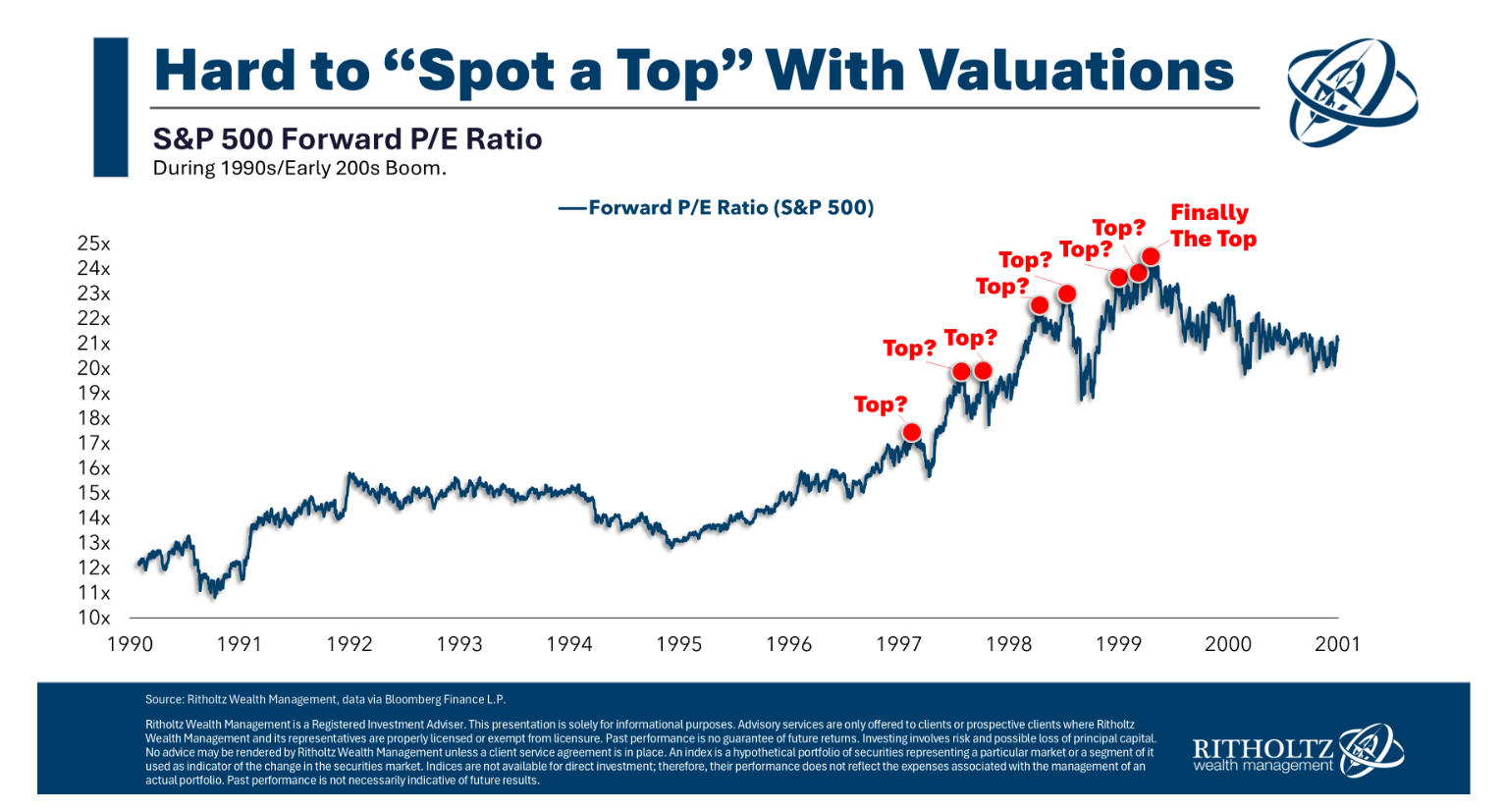- Carlson also points out that it’s very difficult to tell when valuations have peaked, and has this nifty chart showing the many peaks of the dot-com boom in the late 1990s: