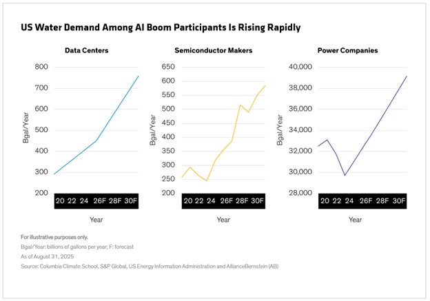 - AI’s data center buildup won’t just require lots of energy—it will also require lots of water. AllianceBernstein has an illuminating chart that projects a 33% increase in water demand over the next 5 years:
