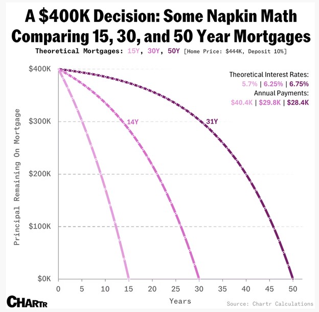 - President Trump has floated the idea of a 50-year mortgage. Sherwood’s Claire Yubin Oh and David Crowther do some math, and find that while monthly payments are slightly lower, as per the chart below, it would take 31 years to gain $100k in equity on a $444k home purchase: