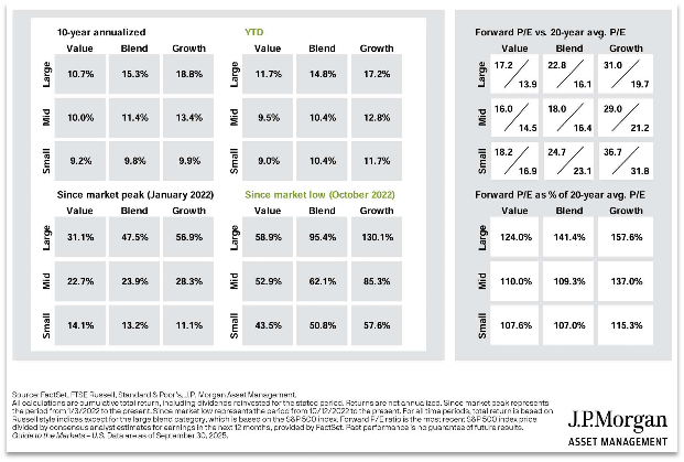 The rising equities tide lifted most boats in the third quarter of 2025. The S&P 500 leapt 8.1%, while the Russell 2000 gained 12.4%. Developed international and emerging markets posted second quarter gains of 4.8% and 8.9%, respectively. As of September 30th, developed international and emerging markets have each posted gains of over 25%. In terms of style, the bull market in domestic equities was broadly distributed in Q3; year-to-date, while large growth leads the way at 17.2%, the “worst” performing style-size combination, small value, is still up 9.0% as of September 30th. The year-to-date chart, coincidentally, shows the same pattern as does the 10-year annualized chart, with large growth leading the way, but all areas posting near-double-digit returns or better.