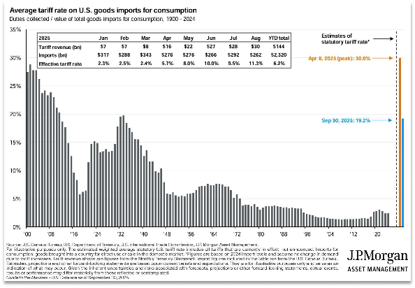 Markets and the Fed are in general agreement that the Fed will cut rates another 1% over the next 18 months or so. More aggressive action may not be needed. The challenge is that inflation remains high enough that the Fed may be reluctant to cut rates too much, while the labor market is softening enough that the Fed may be reluctant to leave rates where they are. If the economy slumps or inflation surges, the Fed will be in the unhappy position of robbing Peter to pay Paul—actions that ameliorate unemployment/inflation pose the risk of aggravating already elevated inflation/unemployment. While ever-changing tariffs have almost become background noise at this point, it is worth noting that the effective tariff rate has risen to 19% (up from 15% last quarter):