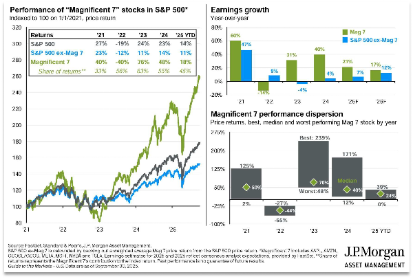 The earnings growth gap between the Mag 7 and the remaining 493 has shrunk greatly in 2025, as has the return gap. And while it’s true that the Mag 7 still accounted for 45% of the S&P 500’s price return as of 9/30, this number is not exceptionally high given that top companies comprise a huge share of the S&P 500’s market cap: