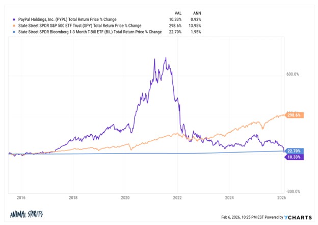 As Carlson notes, PayPal’s long-term performance hasn’t just severely lagged that of the S&P 500—it also has had less than half the annualized returns of T-Bills.
