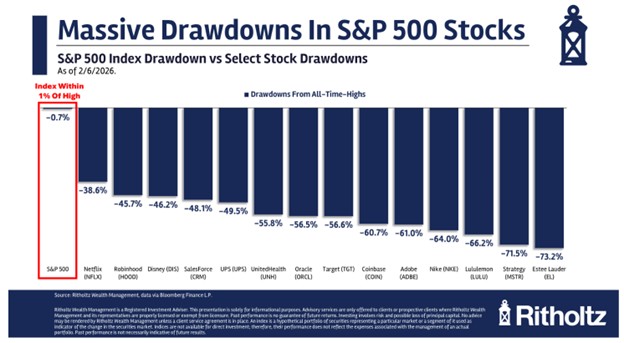 Silver fell over 25% on the last trading day of January, but still finished the month up over 10%. As Carlson notes, supply chain reasons and AI’s demand for physical inputs has probably helped spur silver’s climb. But he also argues that technology’s rapid dissemination of information have enabled markets to move faster and faster, so that hot stocks can become even hotter. If you’re on the right side of an individual stock, the gains can be enormous. But if you’re taking that risk, you’re also exposed to a potentially massive downturn.